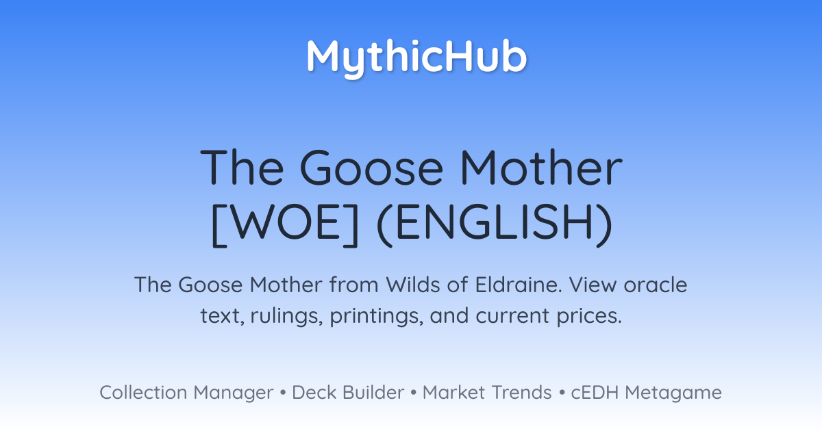 FlyingThe Goose Mother enters with X +1/+1 counters on it.When The Goose Mother enters, create half X Food tokens, rounded up.Whenever The Goose Mother attacks, you may sacrifice a Food. If you do, draw a card.