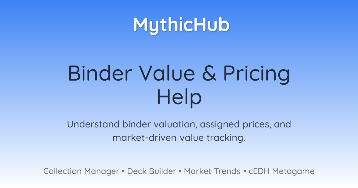 Large collections: For very large binders, MythicHub may temporarily hide the trend chart instead of recalculating a full value history instantly. Your current totals, acquisition value, and gain/loss are still shown, and the chart will refresh overnight once stored trend data is updated.