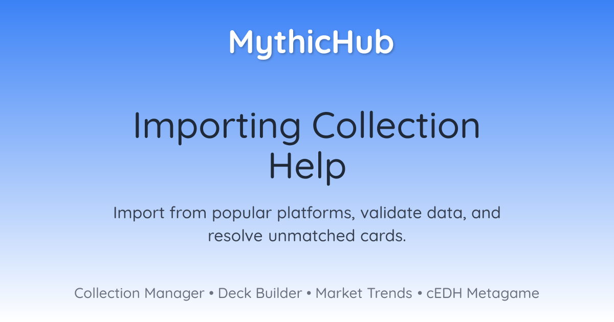 Importing your Magic: The Gathering collection from other platforms to MythicHub is a seamless process designed to help you keep all your cards in one place. Whether you're consolidating collections, importing wishlists, or transferring specific deck inventories, MythicHub supports imports from over a dozen popular platforms.