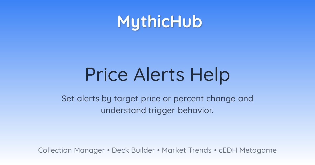 Price Alerts help you keep track of important cards without checking prices every day. When an alert triggers, MythicHub sends you an email alert and disables the alert so you won't get repeat notifications.